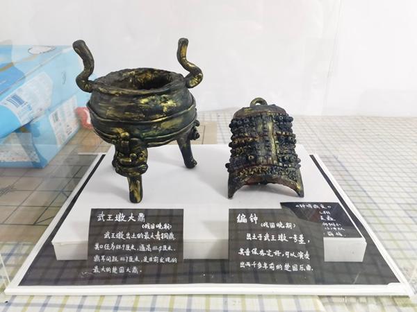 淮南当地举办过“走近武王墩”学生劳动实践比赛等一系列活动。初选后的两百余件作品中,有男孩用黏土做了大鼎和编钟,取名《钟鸣鼎食》;有上初中的孩子仿制了一张很大的漆案,还通了电路,可以声控变换灯的颜色……