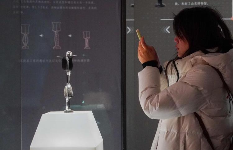 1月27日,在山东博物馆“对话蛋壳黑陶高柄杯”明星文物展上,一名参观者观看龙山文化蛋壳黑陶高柄杯。新华社发