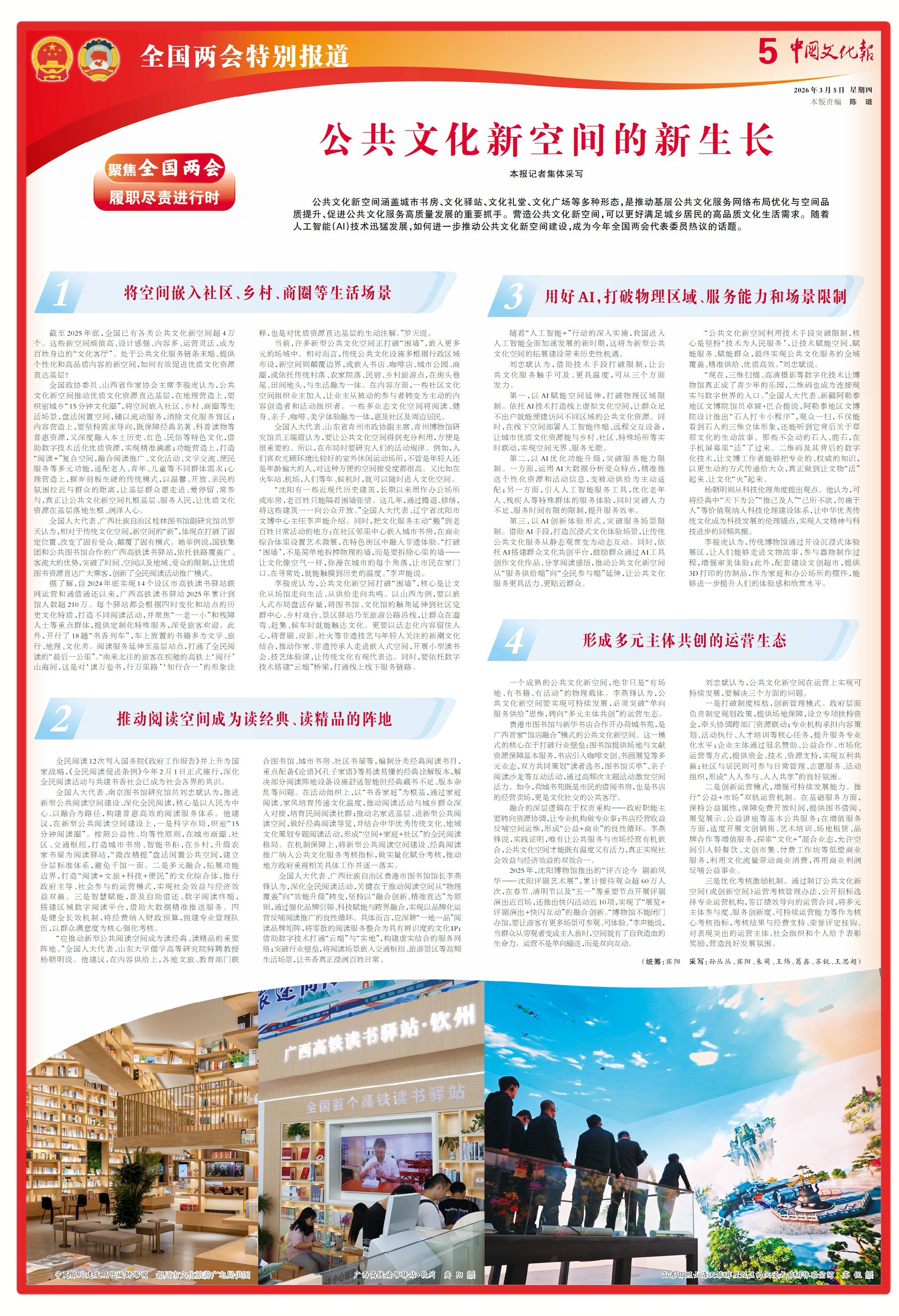 公共文化新空间涵盖城市书房、文化驿站、文化礼堂、文化广场等多种形态,是推动基层公共文化服务网络布局优化与空间品质提升、促进公共文化服务高质量发展的重要抓手。营造公共文化新空间,可以更好满足城乡居民的高品质文化生活需求。随着人工智能(AI)技术迅猛发展,如何进一步推动公共文化新空间建设,成为今年全国两会代表委员热议的话题。