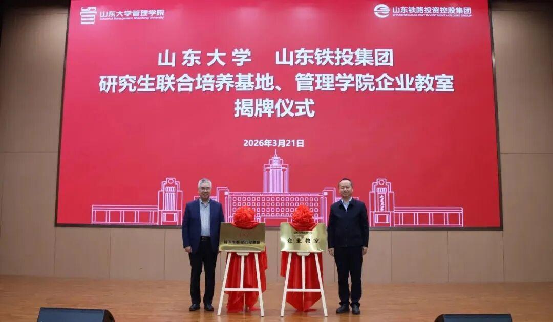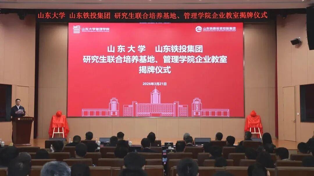 近3月21日,山东大学、山东铁投集团研究生联合培养基地及管理学院企业教室揭牌仪式在济南举办,旨在深化产教融合、推动校企合作,为协同推进人才培养、科研攻关、成果转化搭建专业平台。山东铁投集团党委书记、董事长王卫中,党委副书记、董事乐江华;山东大学财务部部长路军伟,管理学院党委书记付岩志、院长丁荣贵出席仪式。