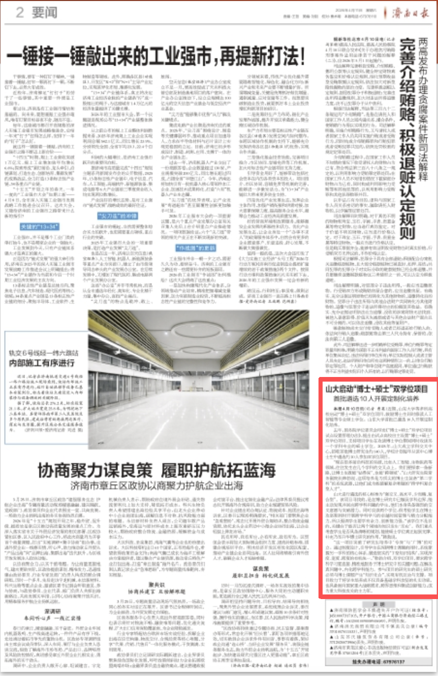 “这一项目突破了研究生培养中‘专深’与‘广博’的对立。通过制度设计,引导学生在深耕博士课题的同时,系统掌握另一学科的核心体系,锻造坚实的‘T型知识结构’,实现深度、宽度、跨度的有机统一。”韩勃介绍,双学位项目,要求跨学科学习要直接、精准地服务于博士研究中的关键问题,在解决真问题中,内化跨学科能力。参与项目的研究生的硕士研究必须与博士课题产生“知识化合”,实现有机互动与支撑。项目致力于将学生培养成不仅具备基础学科攻坚的扎实功底,也具备面向国家重大战略需求,跨界思维和集成创新能力,成为重大科技攻关的主力军。“我们计划把这一项目做成‘样板间’,未来在更大领域推广。”(济南日报·爱济南记者:曹莫)