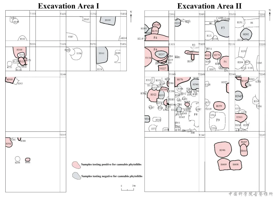 图4 北台上和前冢子头遗址大麻植硅体(粉色)的空间分布示意图