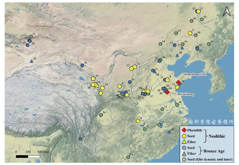 图1 中国新石器时代至历史时期(8000-500 BP)大麻遗存的分布