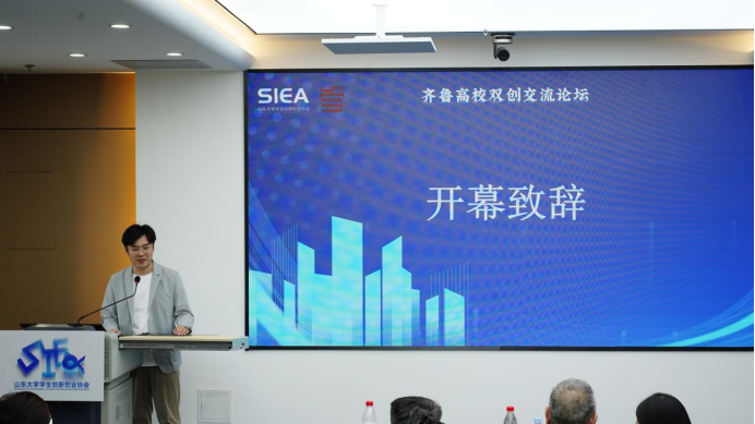 山东大学学生创新创业协会会长陈由伸同学随后代表主办方致辞,对与会嘉宾及各高校代表的到来表示热烈欢迎,并简要介绍了山大创协在链接校内外双创资源、服务学生创业实践方面的探索与愿景。
