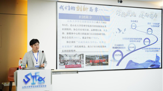 在随后的“聚力前行”环节,山东大学学生创新创业协会会长陈由伸同学,围绕个人创业实践的心得体会与协会在团队建设、资源对接及活动运营方面的组织经验作详细分享,展现了山大青年创新创业组织的活力与担当。
