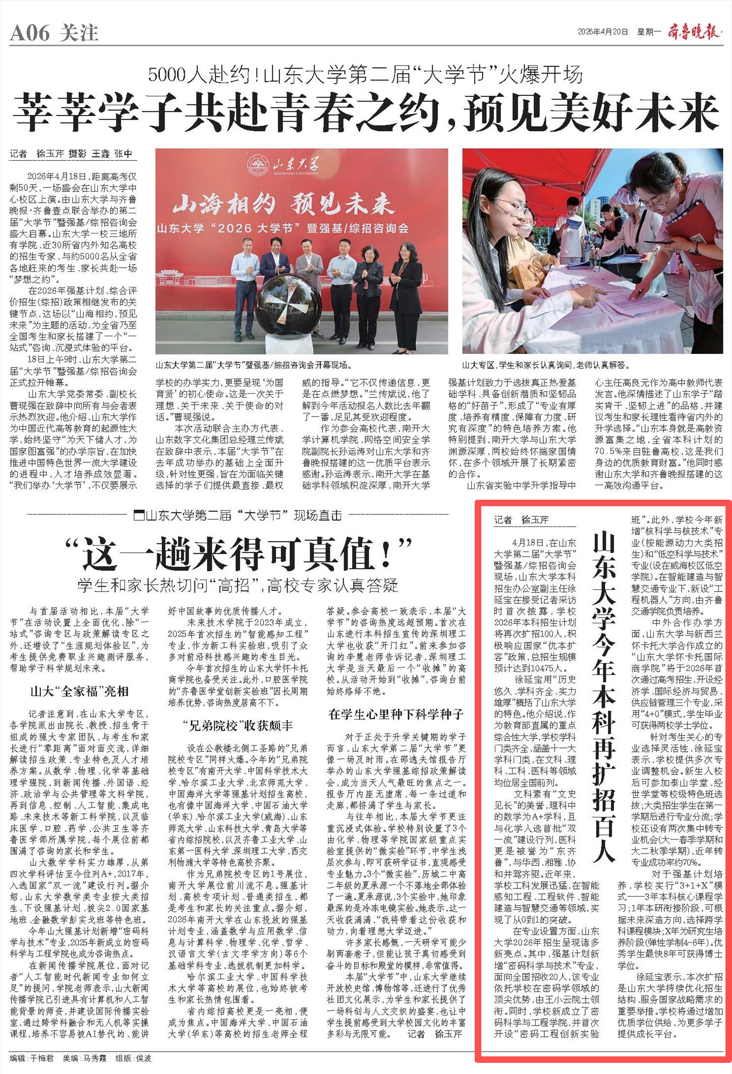 4月18日,在山东大学第二届“大学节”暨强基/综招咨询会现场,山东大学本科招生办公室副主任徐延宝在接受记者采访时首次披露,学校2026年本科招生计划将再次扩招100人,积极响应国家“优本扩容”政策,总招生规模预计达到10475人。