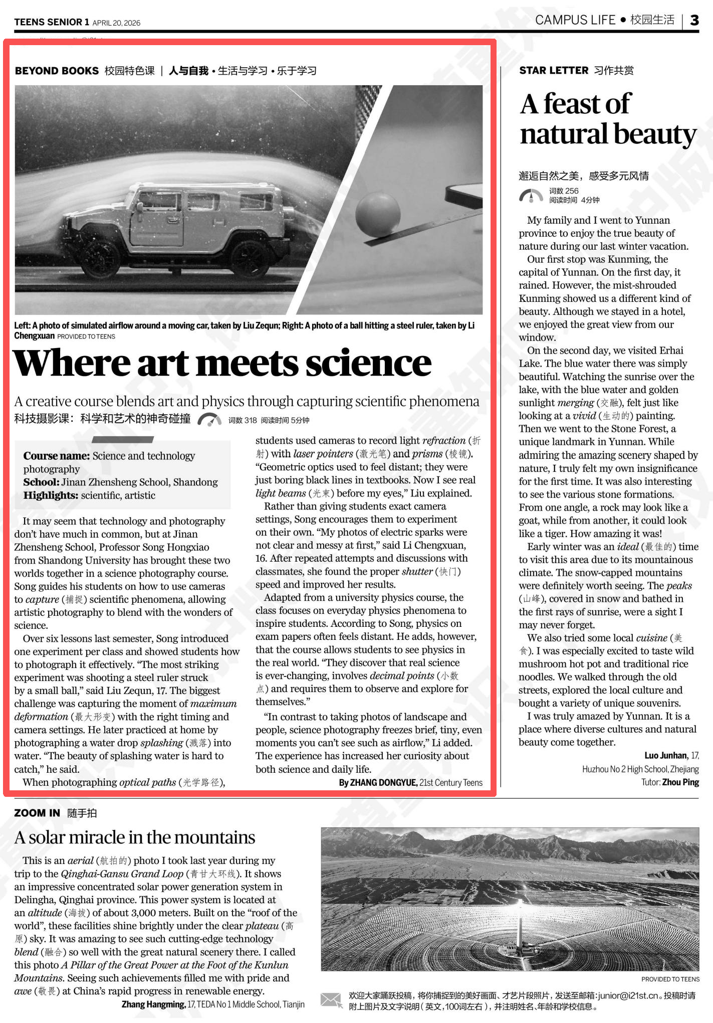 It may seem that technology and photography don’t have much in common, but at Jinan Zhensheng School, Professor Song Hongxiao from Shandong University has brought these two worlds together in a science photography course. Song guides his students on how to use cameras to capture (捕捉) scientific phenomena, allowing artistic photography to blend with the wonders of science.