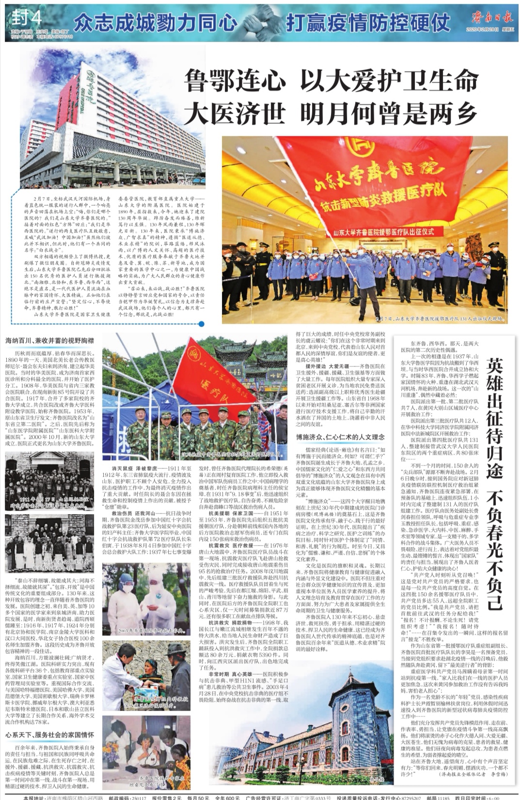 双方相遇的视频登上了微博热搜,更刷爆了微信朋友圈。自新冠肺炎疫情发生后,山东大学齐鲁医院已先后分四批派出150名优秀的医护人员逆行驰援湖北。“南湘雅、北协和、东齐鲁、西华西”,这绝不是虚名,是一代代医护人员流淌在血脉中的家国情怀、大医精诚。正如他们在临行前的庄严宣誓:“坚定信心,不辱使命,齐鲁精神,敢打必胜!”