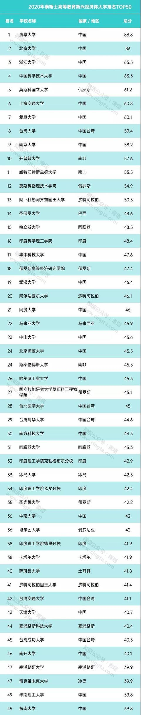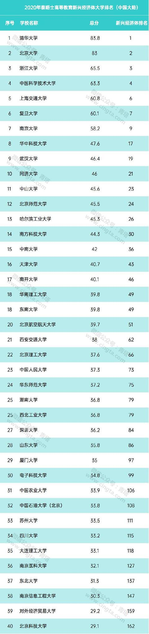 2020年泰晤士高等教育新兴经济体大学排名中,来自中国大陆的高校连续第三年在前10名中占据7席。