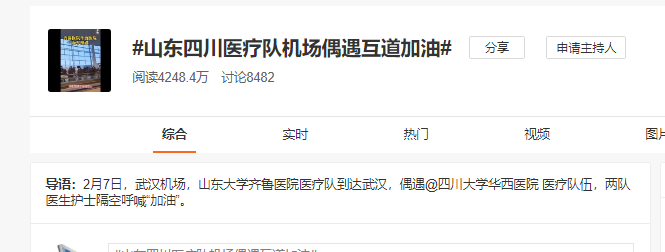 华西医院和齐鲁医院医疗队在机场偶遇的视频发布后,人民日报、齐鲁晚报纷纷转发。2月8日上午,微博话题#山东四川医疗队机场偶遇互道加油#的阅读量达到4200多万,讨论超过8000条。